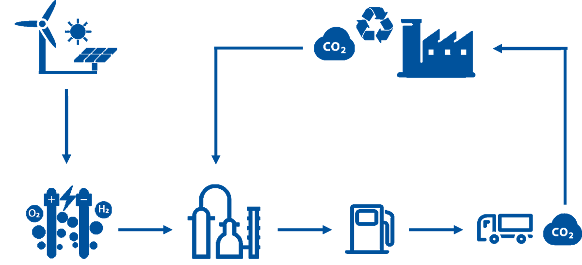 L'idrogeno viene combinato con CO2 riciclata per produrre un carburante sintetico. I filtri in fase di sviluppo per la cattura e lo stoccaggio di CO2 sono un aspetto fondamentale per i carburanti "Power-to-Liquid". La raccolta della CO2 rilasciata durante la combustione e la sua combinazione con l'idrogeno sono i due passaggi che completano il ciclo. La CO2 emessa dagli scarichi viene infatti utilizzata per produrre nuovo carburante.